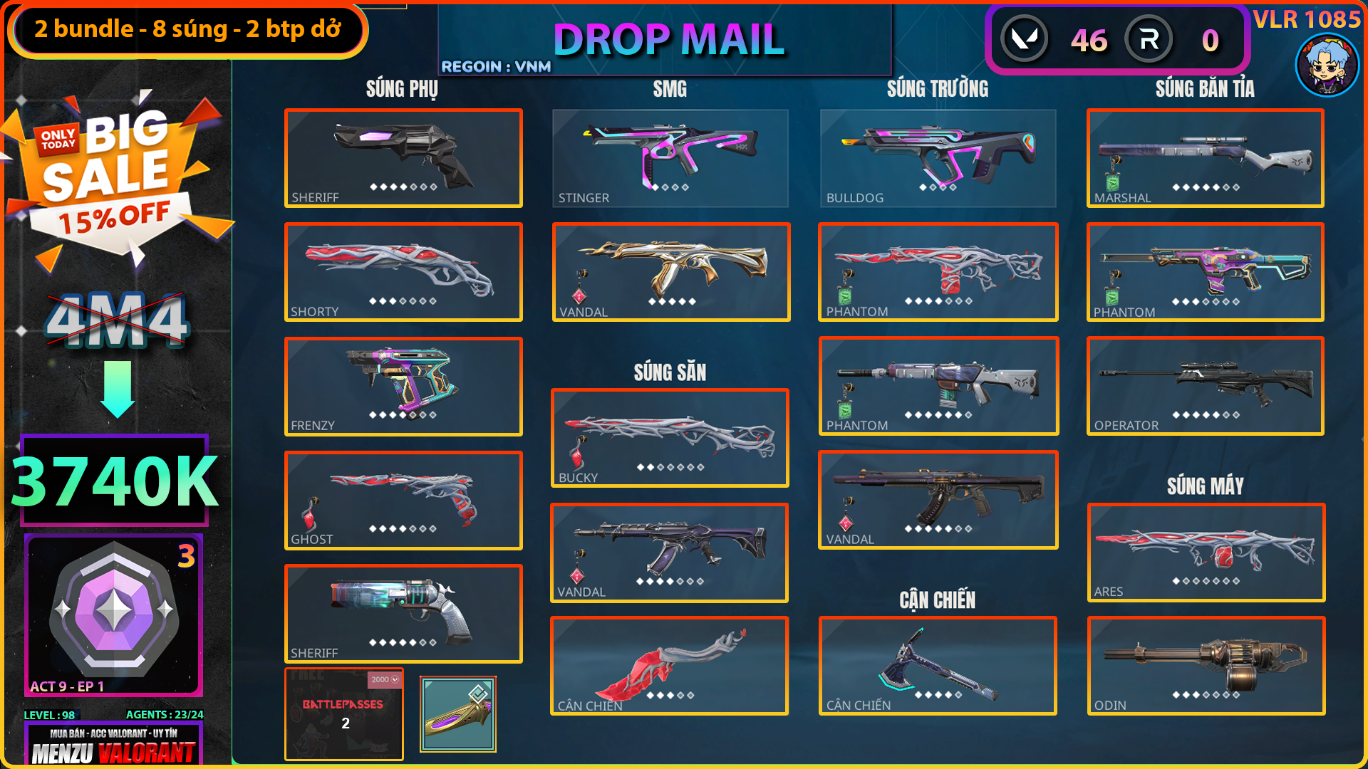 Acc Valorant vlr1085 | Rank PLATINUM 2 | Giá: 3.740.000đ