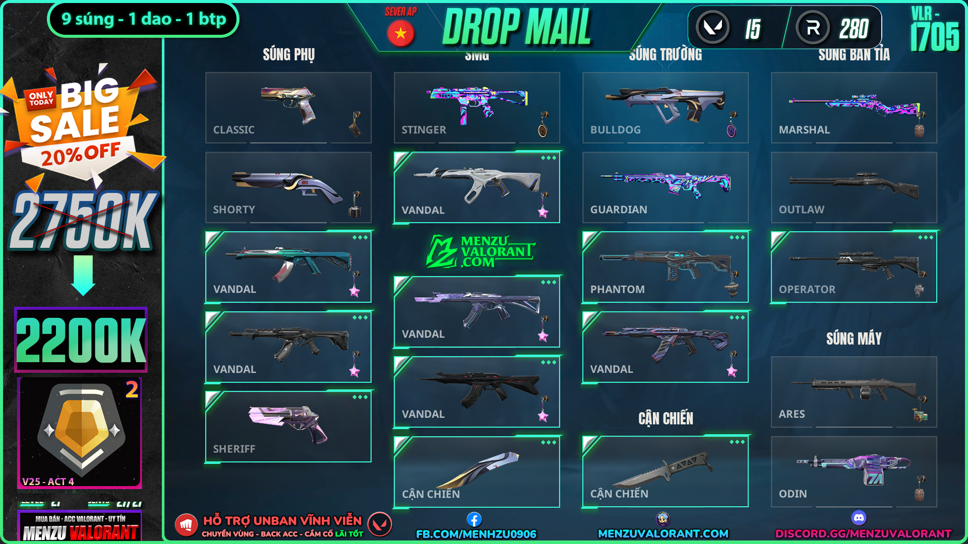 Acc Valorant vlr1705 | Rank GOLD 1 | Giá: 2.200.000đ