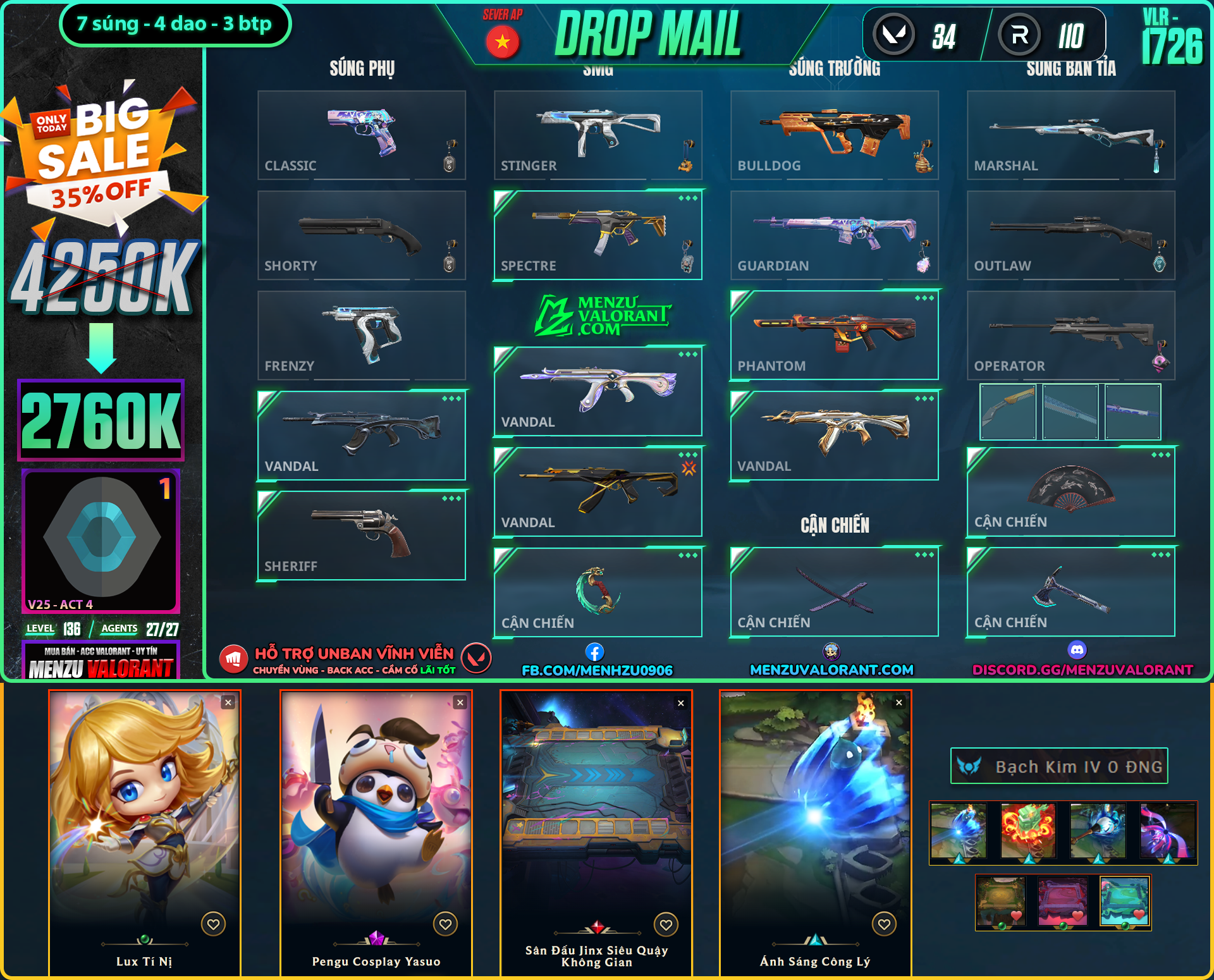 Acc Valorant vlr1726 | Rank PLATINUM 1 | Giá: 2.760.000đ